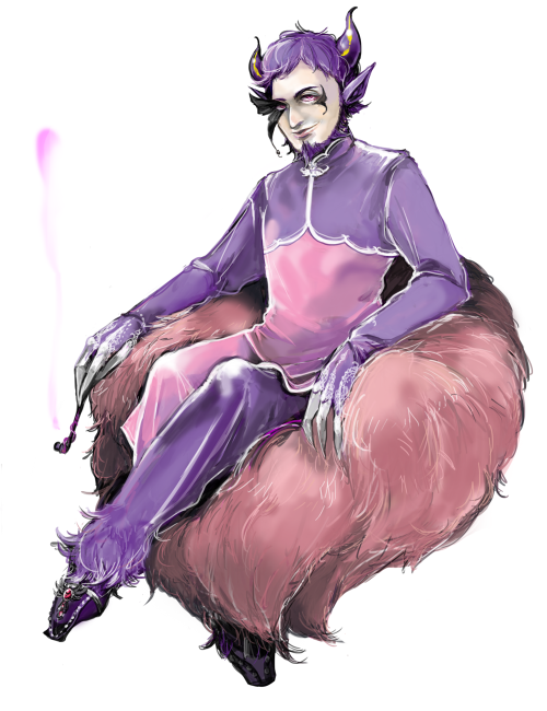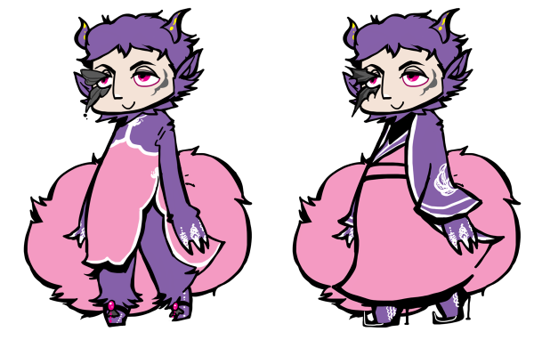 紫の尖り耳と角があります。手の指は三本ですが気分的にうっかり増えます。